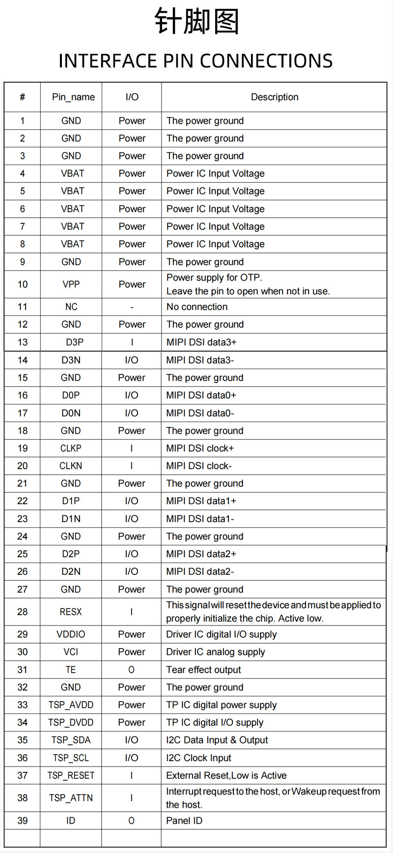 - Pin No(针脚数量):39