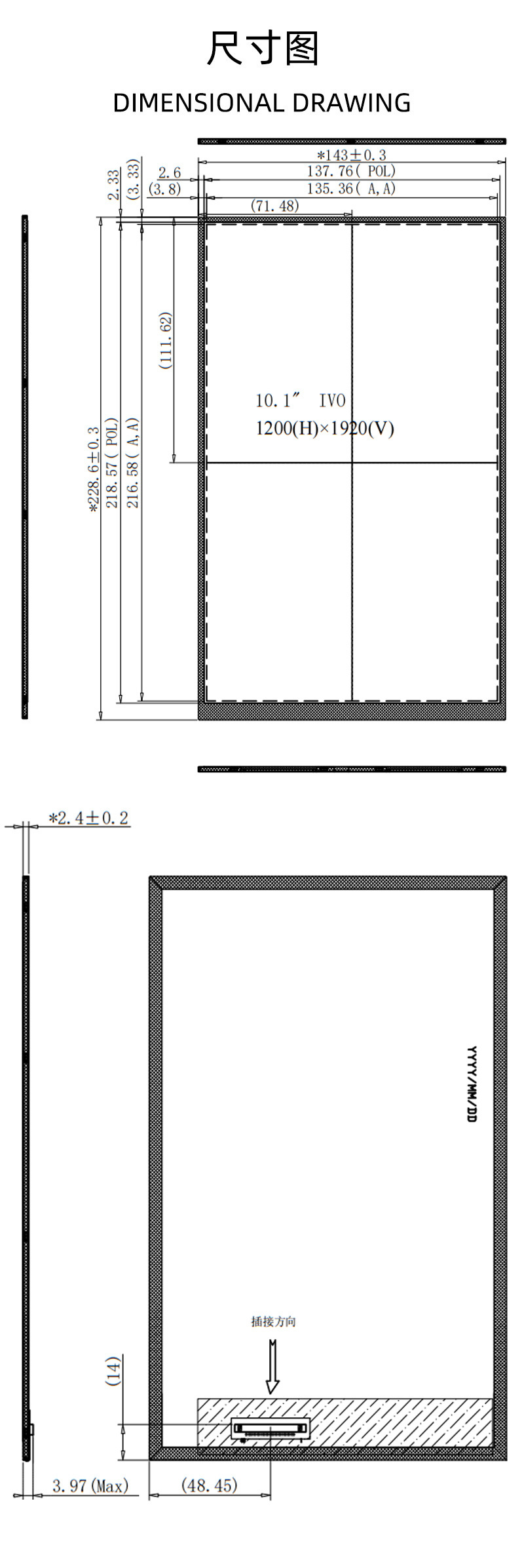 - Outline Dimension(外框尺寸):228.6x143