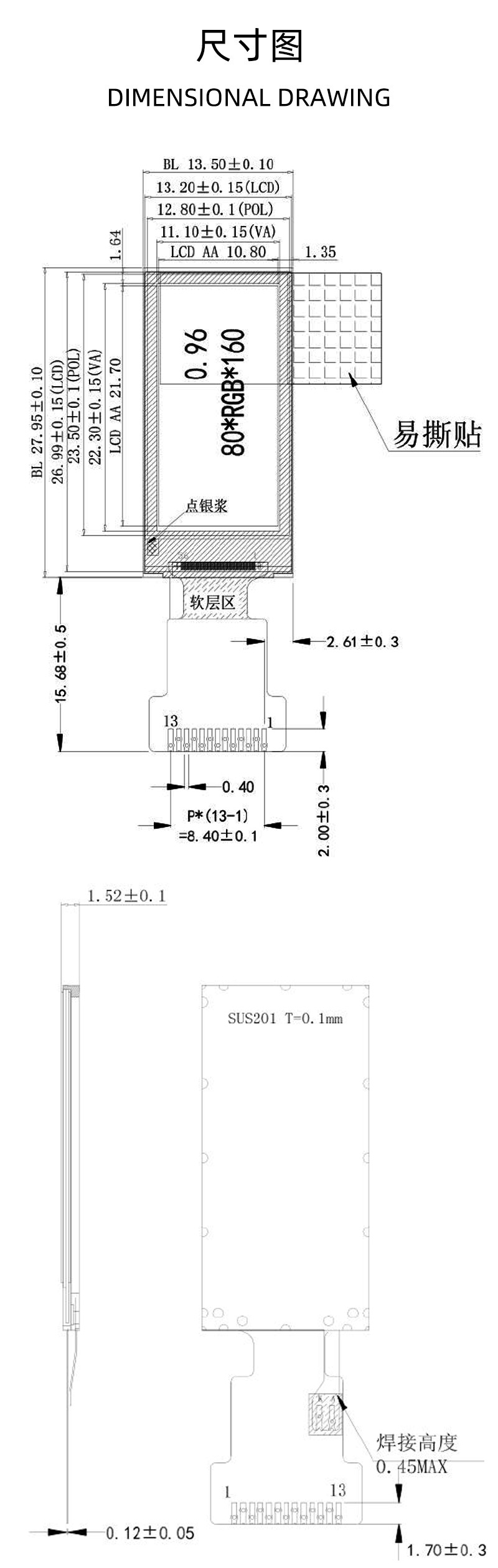 - Outline Dimension(外框尺寸):13.5*27.95