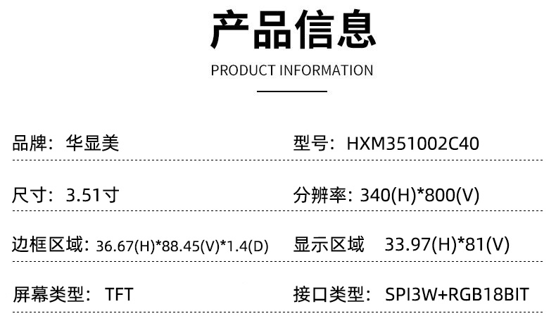 - Interface(接口):SPI3W+RGB18-BIT