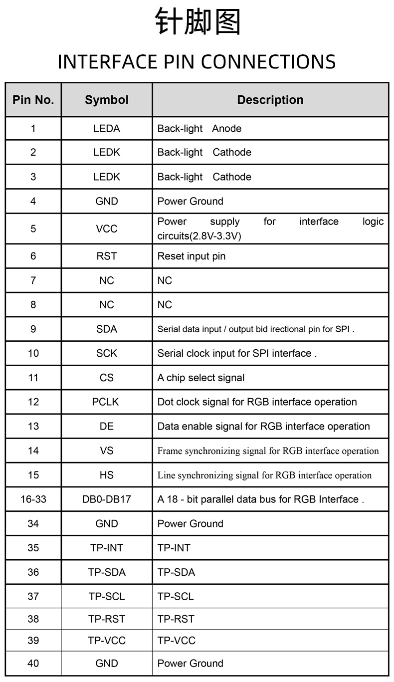 - Interface(接口):SPI3W+RGB18-BIT