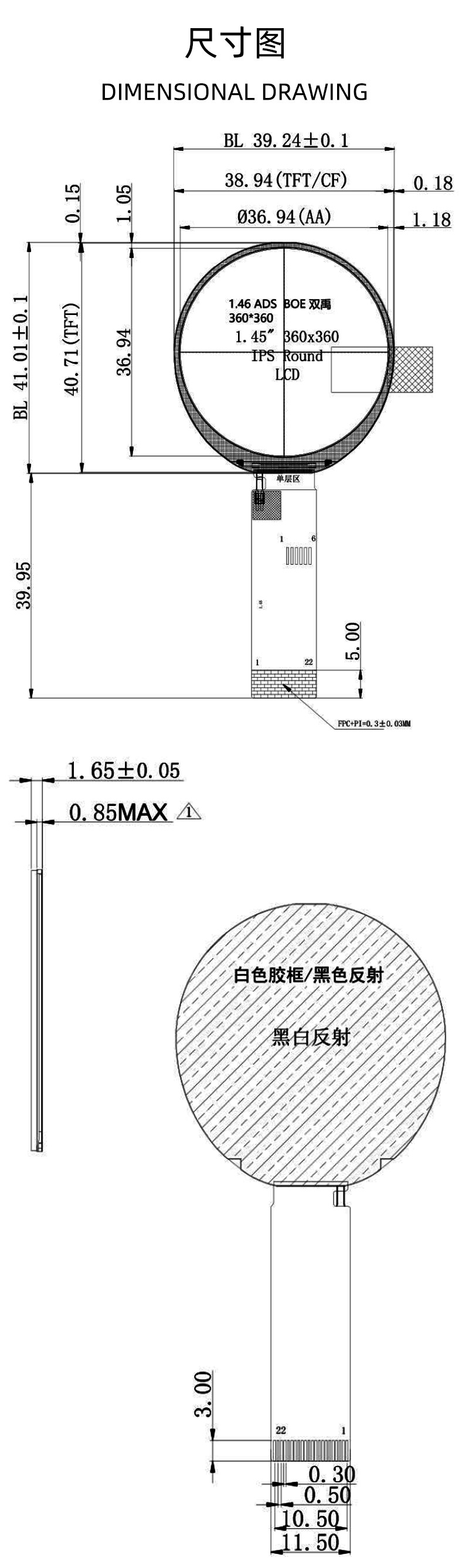 - Active Area(显示尺寸):36.94x36.94